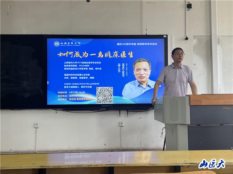 6月17日下午,由我校教务部主办的喜迎建校105周年·教育教学系列活动在迎泽校区举行。我校1977级临床医学专业校友、美国南加利福尼亚大学医学院乔人立教授受邀讲授了题为“做一个自信的医生”的主旨报告。讲座由教务部部长覃凯主持,第一临床医学院呼吸与危重症医学科负责人施熠炜主任医师、学校教务部相关人员及临床类专业师生代表200余人参加了活动。