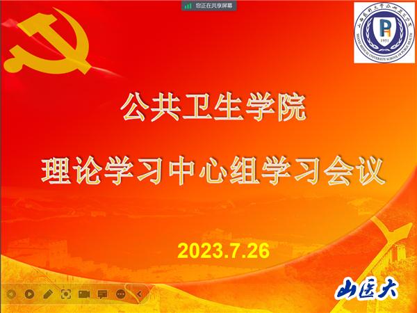 7月26日上午,公共卫生学院党委理论学习中心组以线上会议形式召开集中学习会议,学习习近平总书记在文化传承发展座谈会上的重要讲话精神、习近平总书记在内蒙古考察时的重要讲话精神,《习近平新时代中国特色社会主义思想专题摘编》中“积极参与全球治理体系改革和建设”专题等,院领导、党委委员、分团委书记、组织员、教工党支部书记代表、研究生党支部书记代表参加了会议。学院党委书记张志红主持会议。