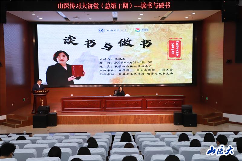 在第30个世界读书日暨第四届全民阅读大会即将来临之际,4月21日下午,由校党委宣传部、学生工作部、校工会主办,易班学生工作站和“橘井阅微”书友会承办的“山医传习大讲堂”之“培育读书风尚 建设文化强国”专场在中都校区举行,特邀四川巴蜀书社社长王祝英编审作专题讲座。学校相关部门负责人,来自全校的300余名阅读爱好者和“橘井阅微”书友会成员等聆听了讲座。