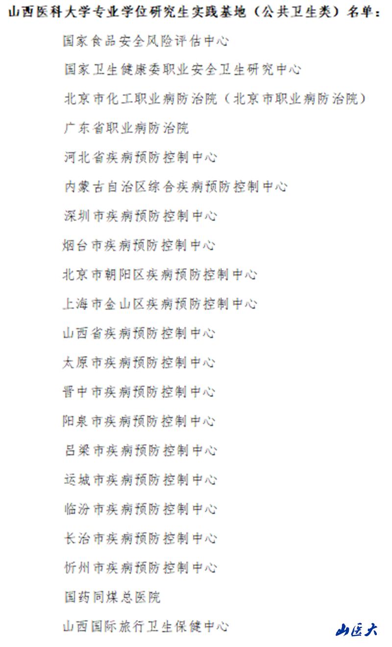 为提升公共卫生专业研究生的实践能力,推进校地联合培养力度,近日,我校研究生院、公共卫生学院领导组织专家对北京、上海、广东、山东、河北、内蒙古、山西等省份的几十个专业学位研究生实践基地申请单位进行实地考察、专家论证,最终确定国家食品安全风险评估中心、国家卫生健康委职业安全卫生研究中心等21家单位为我校公共卫生类专业学位研究生实践基地。