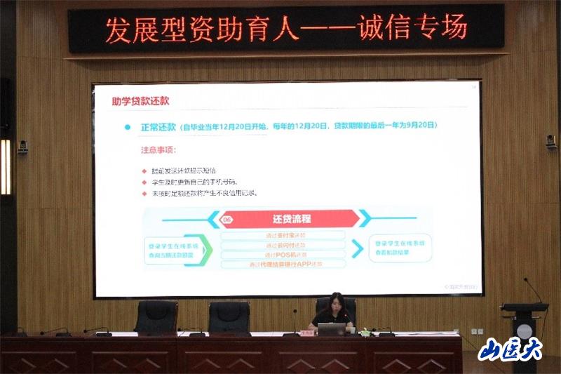 6月9日,我校在中都校区举办第六期发展型资助育人教育活动——诚信专场“保障金融权益 助力美好生活”讲座。国家开发银行山西省分行助学贷款业务经理李雨婷主讲。山西省教育资助与保障中心张素萍、郭璐璐老师,国家开发银行山西省分行相关工作人员,学生工作部副部长杨洋,教师代表白雪、崔春阁,获奖受助学生代表参加。