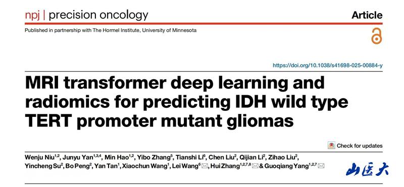 近日,我校医学影像学院张辉教授团队在Nature旗下子刊《npj Precision Oncology》杂志发表题为“MRI transformer deep learning and radiomics for predicting IDH wild type TERT promoter mutant gliomas”的最新研究成果。医学影像学院2022级医学影像技术专业本科生牛文举为第一作者,硕士研究生闫俊羽、郝敏等为共同作者,张辉教授、杨国强副教授和首都医科大学附属北京天坛医院王磊主任医师担任共同通讯作者。