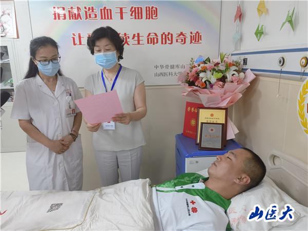 (第二医院血液科马艳萍主任、山西分库高凡主任为捐献者授牌)