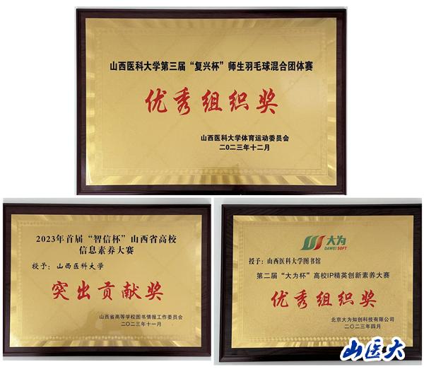 同时,我校图书馆还荣获了山西省高校图工委2023年首届“智信杯”山西省高校信息素养大赛“突出贡献奖”、第二届“大为杯”高校IP精英创新素养大赛 “优秀组织奖”。