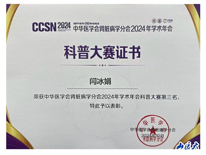 10月16日至20日,中华医学会肾脏病学分会2024年学术年会在重庆召开,在年会举办的首届科普大赛上,由山西省医学会肾脏病学分会推荐参赛的我校第二医院肾脏内科闫冰娟主治医师经过激烈竞争,夺得大赛第三名的好成绩。
