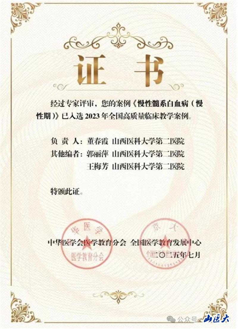 近日,中华医学会医学教育分会、全国医学教育发展中心公布了国家级全国高质量临床教学案例库入选名单,我校第二医院董春霞、郭丽萍、王梅芳团队的《慢性髓系白血病(慢性期)》教学案例入选。