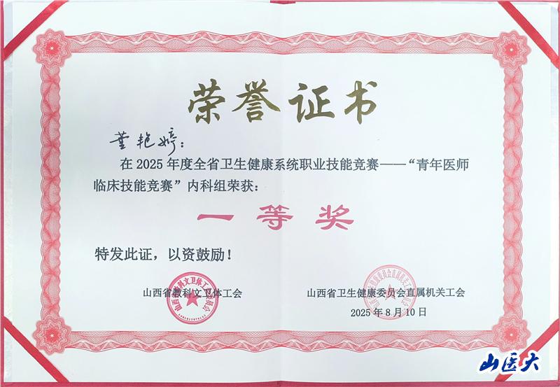 在本次大赛的个人奖项角逐中,董艳婷凭借其在内科领域全面过硬的临床技能、精准的临床判断和稳定的临场发挥,在“青年医师临床技能竞赛”中力拔头筹,斩获内科组一等奖,充分展现了我校青年医师的顶尖个人实力。